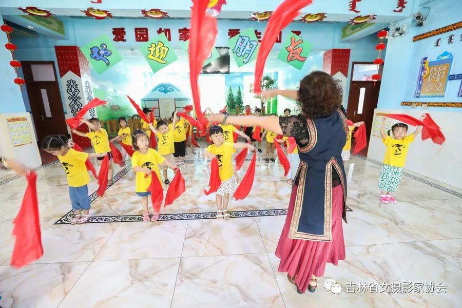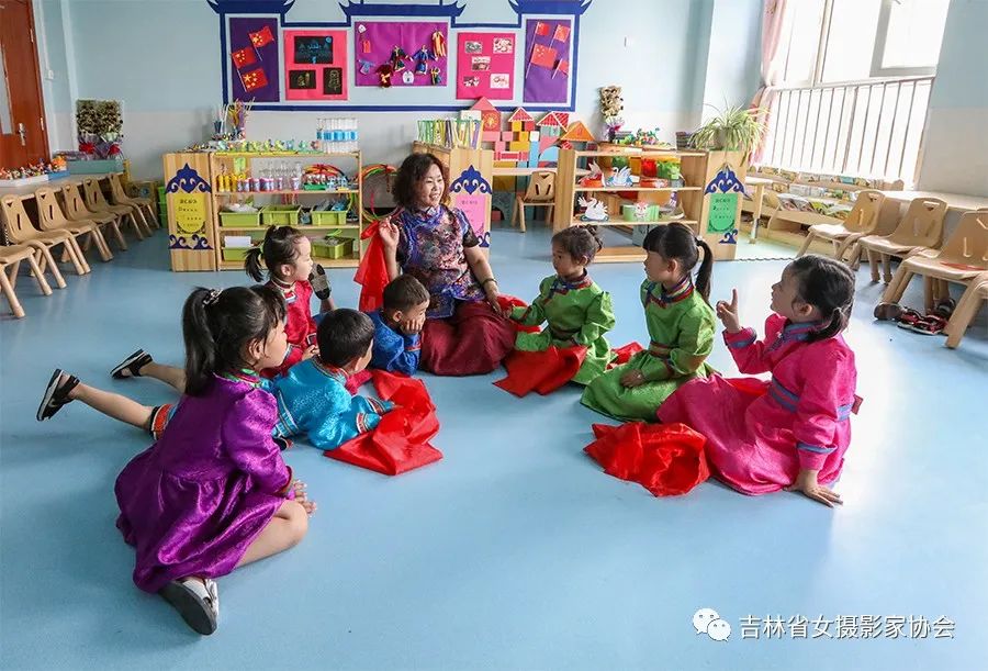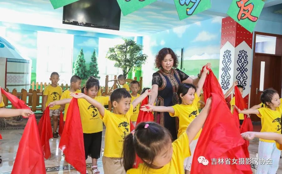 代表性传承人于华在前郭县蒙古族幼儿园教跳蒙古族安代舞![]()