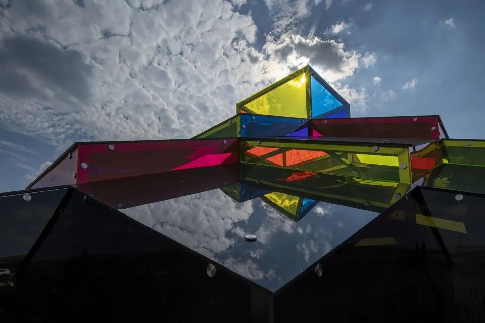 基于空间形态的几何设计,选用彩色亚克力与深色亚克力进行交错布置。从而让装置空间随着自然光线的变化和云层的移动,呈现不同的色彩组合的动态投影。使装置超越静态空间的范畴,成为具有”呼吸感”的有机体。