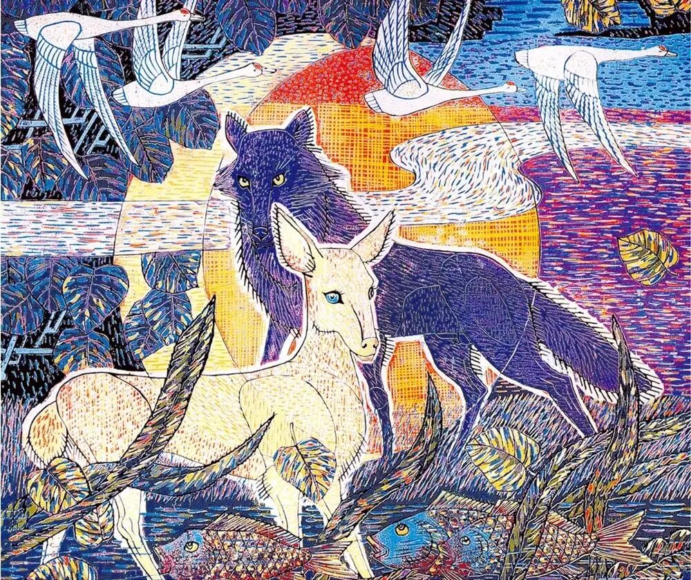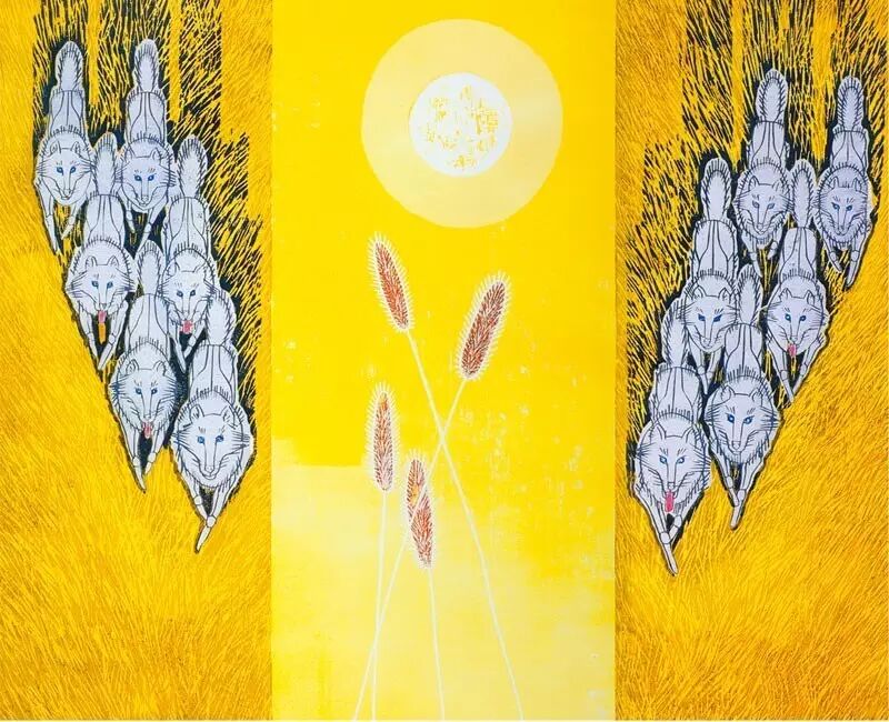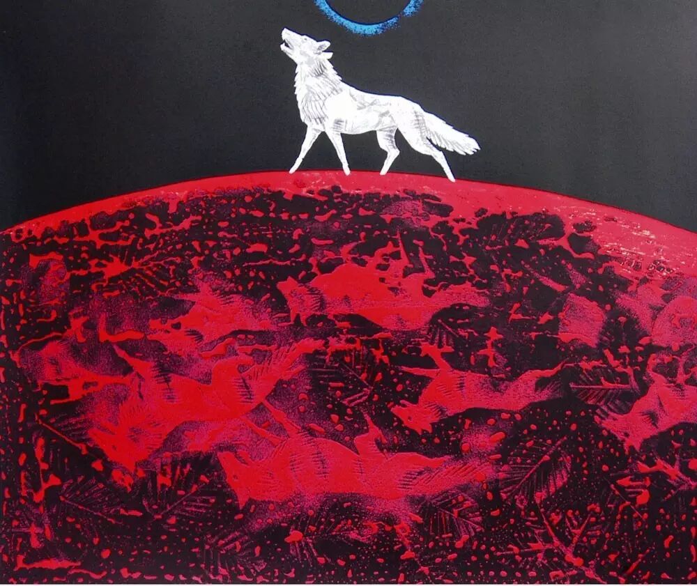 《苍狼与大地》丝网版/60x71cm/2001年(入选“2008·北京奥运美展”、“浩瀚草原·全国美术作品展”)