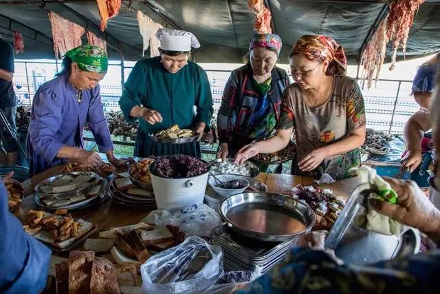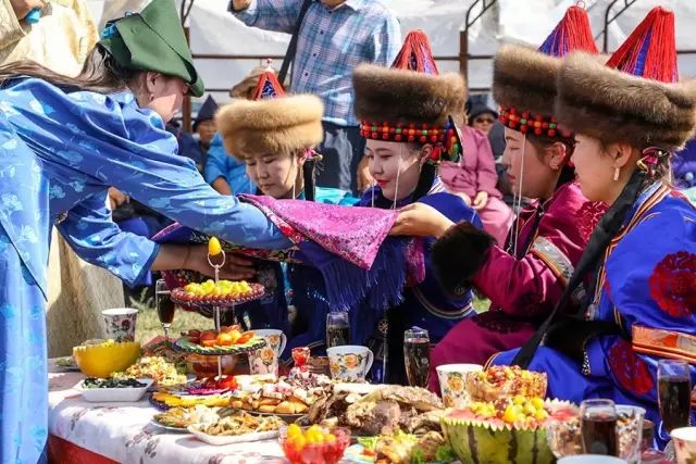 布置得像蒙古包的宴会场上,布里亚特人开心地喝着奶茶,吃着手把肉,这种饮食的方式,其实跟他们日常的饮食一模一样,可以说是他们日常生活的放大。