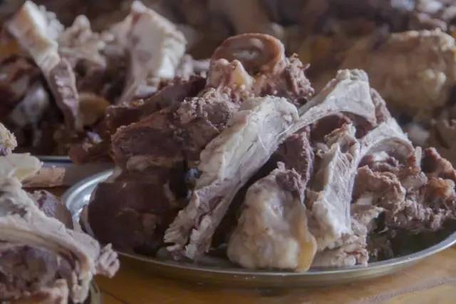 大骨、大排在傍晚的时候开始下锅煮制,连夜煮好。煮好的肉第二天切分,男宾和女宾吃的部位不一样,所以上桌的时候肉是要分成不同的盘。