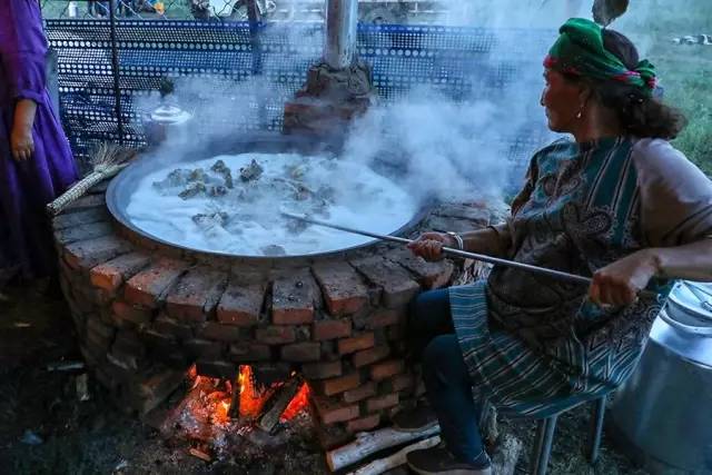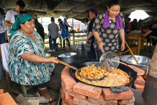 面点的制作都是女性完成,因为所需的量非常大,从发面、切分到炸制,几十个人要做上一整天。因为是用牛油和羊油炸的,可以放上好几天,随时配奶茶吃,很抵饿。