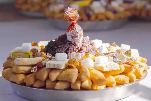 传统食物八宝饭也是面点拼盘的一部分,它用一种叫臭李子的野果做成果酱,跟奶干、列巴、油饼、红枣、葡萄干等食物混合,寓意新婚生活美满富足。