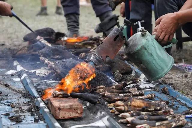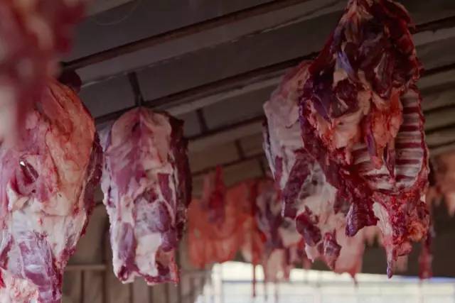 羊头、羊蹄因为皮毛较多,要先用火烧,再刮洗干净。羊皮和羊肉则将移入备菜棚内,有专人按部位切分,码放整齐。