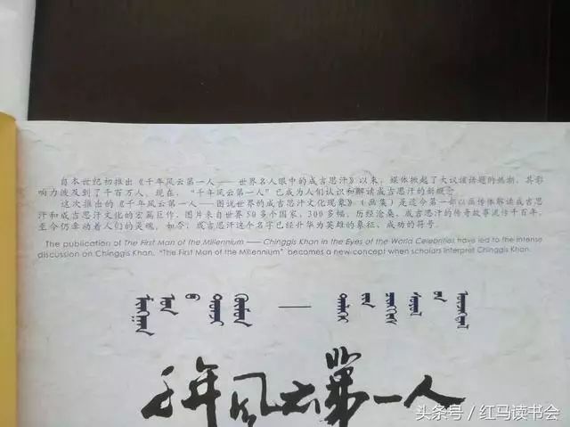 《千年风云第一人——世界名人眼中的成吉思汗》原版为2003年1月出版,2004年7月第二次印刷。内容包括60多个国家和地区400多位名人、学者的评论摘要;新增400多幅珍贵图片,集中反映了古今中外画家对成吉思汗的理解和解读;增加了必要的说明和注释,强化了该书的知识性积和可读性,全书约80万字,包括正文、背景介绍和图片说明。该书全面系统地综合了世界名人、学者评述成吉思汗的文章。