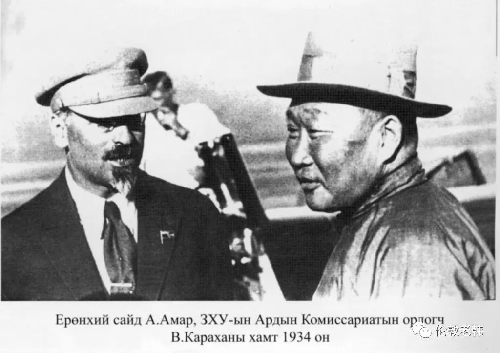 站在阿玛尔身旁的是博勒吉德·根登(Пэлжидийн Гэндэн),蒙古政府左倾领导人,其任期在阿玛尔两届任期中间,因执行斯大林的激进政策躲过清洗。