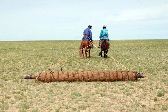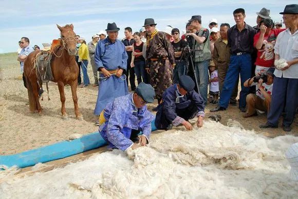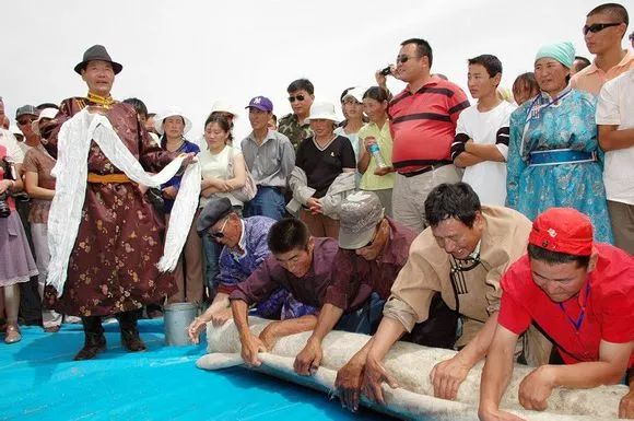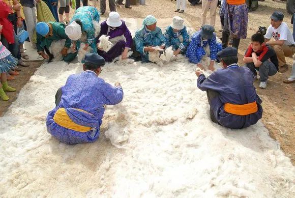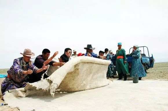 擀毡子这个活儿也是需要集体参加的劳动,有男有女,一起有说有笑,互相打打闹闹,好不热闹。擀毡子的地方,一般都是选在河边,离水最近的地方,场地比较开阔而平坦。大队也要在旁边支起帐篷,负责烧水熬茶。大家都是天蒙蒙亮即洗漱喝茶完毕赶到现场,趁天还没大热就开始干活。擀毡子的程序基本是这样的,根据所需毡子面积大小,在场地四周角上钉上矮木蹶子,再用细绳围成四边形(有的是在下面放一张大的苫布,作为底衬)。然后把成堆的羊毛倒在这个四边形之内,摊成薄薄一层。参加的人们在各个边上手持细柳条,敲打羊毛,目的是把羊毛打散,而让它蓬松起来,就像内地的弹棉花工差不多。大家一边打着,一边互相玩笑着,打闹着,但手中的柳条始终不停。直到一位掌管师傅说可以了,即停手,随后用水盆或水桶提水,往蓬松好的羊毛上面浇水,水浇透后,人们撤后,牵来2、3匹马,每匹马拉着一个重重的石碌碡(和内地夏收或秋收压场一样的石头滚子),在羊毛上反复来回地压,直到师傅认为压得够了力度了,即停止。然后再往上面铺羊毛,而重复上面的敲打,浇水,碌碡压的过程,根据所需的厚度,一般都要重复5~6次以上,最后要将毡面翻过来,压底面,经过反复多次才算是完成。擀成的毡子放到另外的地方晒晾,直到干透即告完成。在擀毡场地再进行下一块的操作。当年生产队擀制的毡子面积都很大,一般都在1~2丈长,6~7尺宽。记得当时负责擀毡的牧民,还往摊平羊毛上撒一种白色的粉末,似乎是芒硝一类的东西,据说既能增加羊毛之间的黏合力,还有防虫蛀的作用。为了使毡子韧性好结实,擀毡子另一个技术性强的活是收边,即要把四边收成即整齐,又光滑,这个就不是所有人都能做好的,而擀毡子师傅也大都秘而不宣。