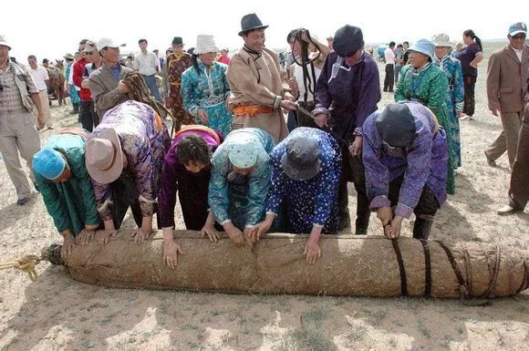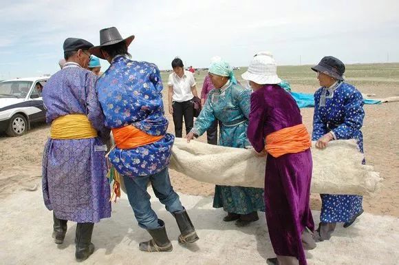 擀毡子的劳动强度不是很大,但就是要遭太阳的暴晒,越是太阳强的天,越有利于擀毡子。而当时的牧民青年男女也都乐于参加这样的集体劳动,因为在这种场合一般都不受家中老人的管教,可以自由自在的和异性交流感情,甚至谈情说爱了。