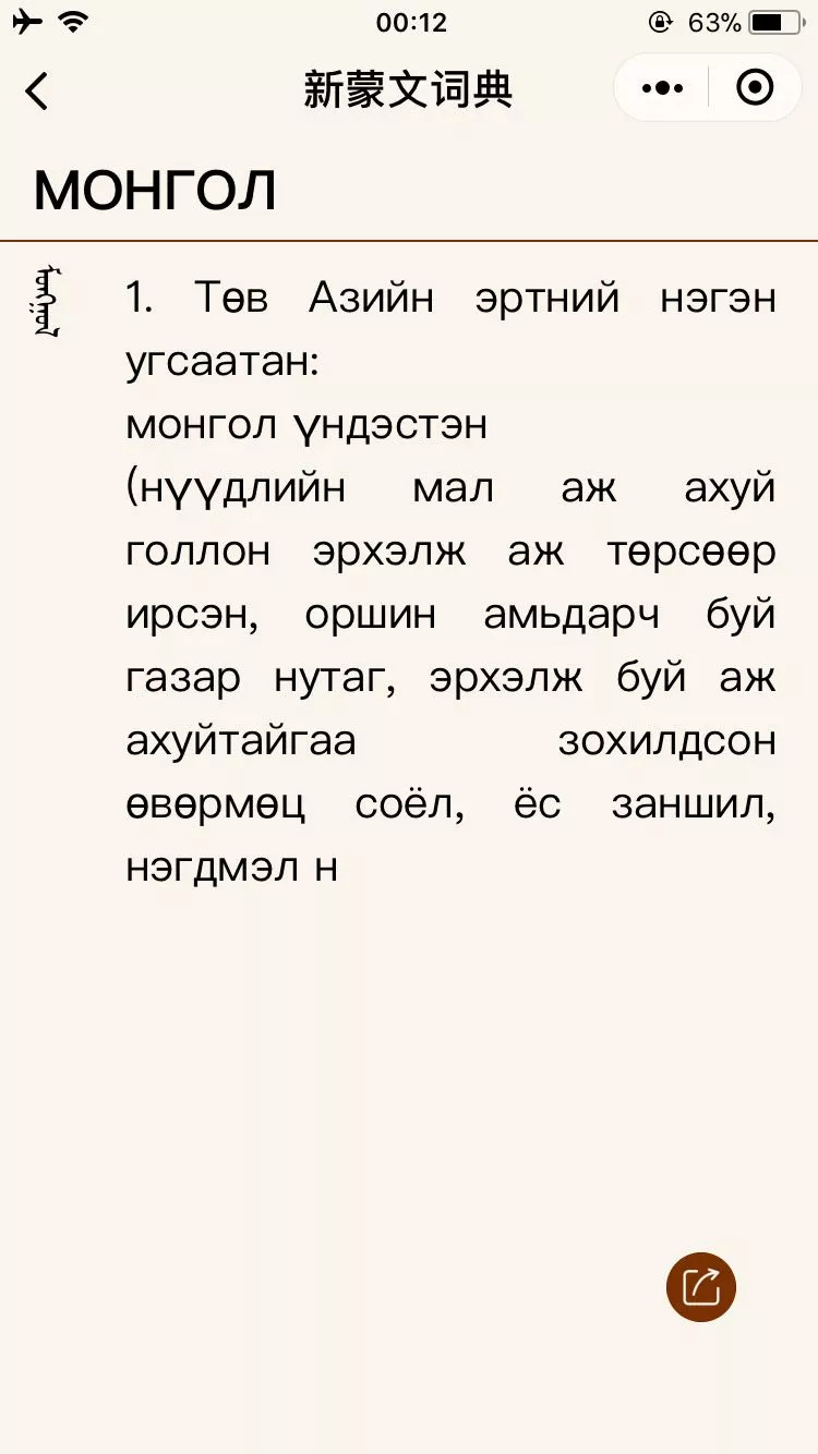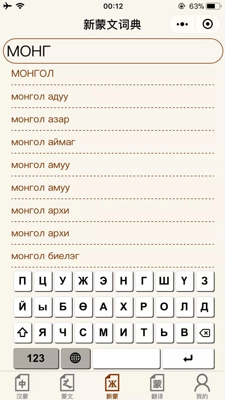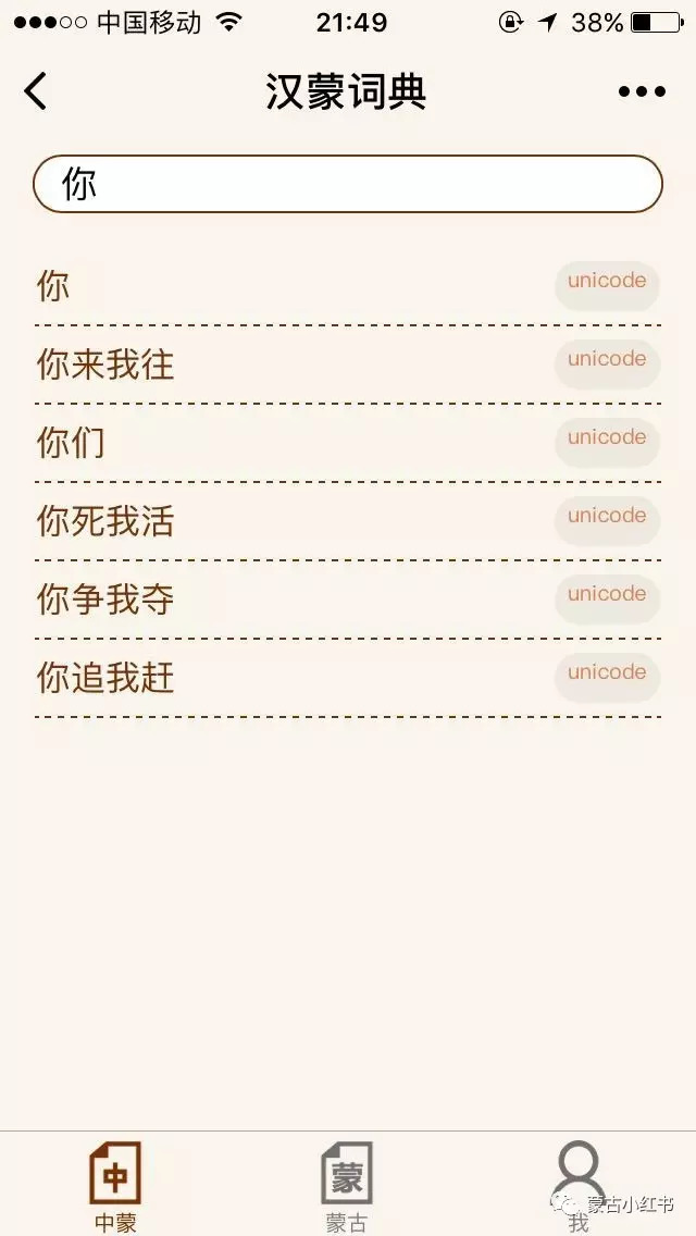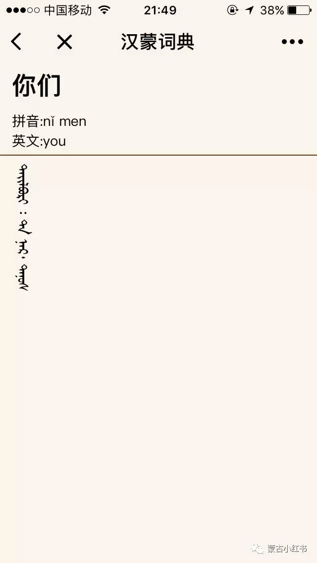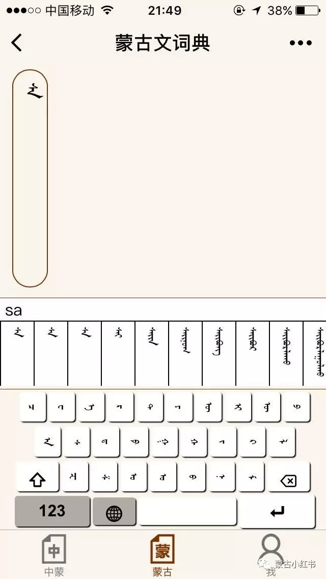 进入小程序后输入要查询的中文,然后点击键盘下的《完成》按钮,列出要找的相关汉语词字,点击进去就显示传统蒙古文相关翻译了。