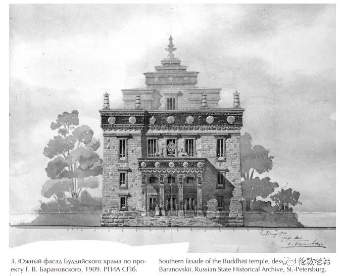 寺庙在1915年落成。但在1913年庆祝罗曼诺夫王朝300周年的时候,那里就已经举行了首次佛教诵经活动。阿格万在讲话感谢沙皇对圣彼得堡佛教徒的支持。那一年一个名为乌利亚诺夫的喇嘛出版了一本书,书中声称证明了罗曼诺夫是传说中香巴拉的国王苏禅德拉(Sucandra)的后裔。