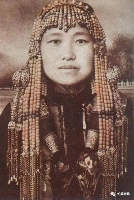 下面这张摄于同时期(20世纪初),这是鄂尔多斯准格尔旗的带头饰的女子。这两张照片能显示东西部蒙古人面像的不同特点。
