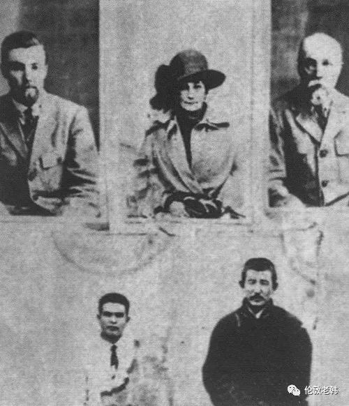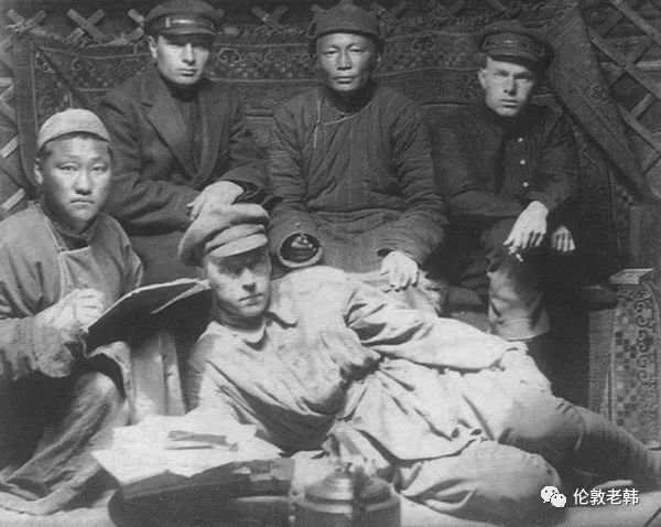 坐在蒙古格鲁乌(军事情报部)负责人纳穆吉勒(Намжил Хаянхирва)旁边(1926-1928)那个不戴帽子的俄罗斯人是布柳姆金(Яков Блюмкин)。