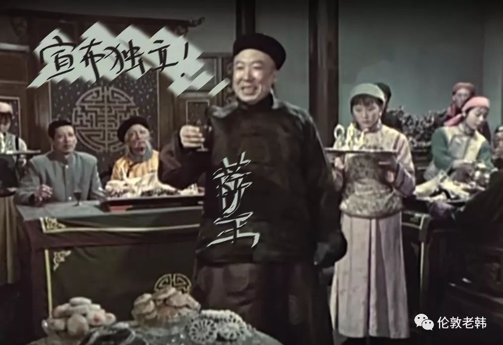 后面坐的德高望重的老王爷是主张猫论的利己主义者(不管黑猫白猫,能捉老鼠的就是好猫):只要王公协理还是王公协理,老爷还继续做老爷,怎么折腾都行。