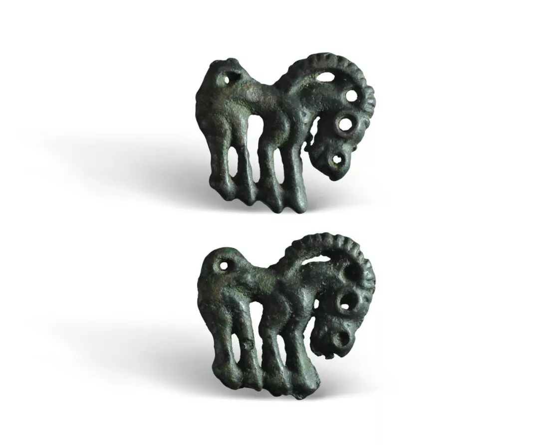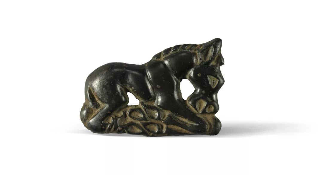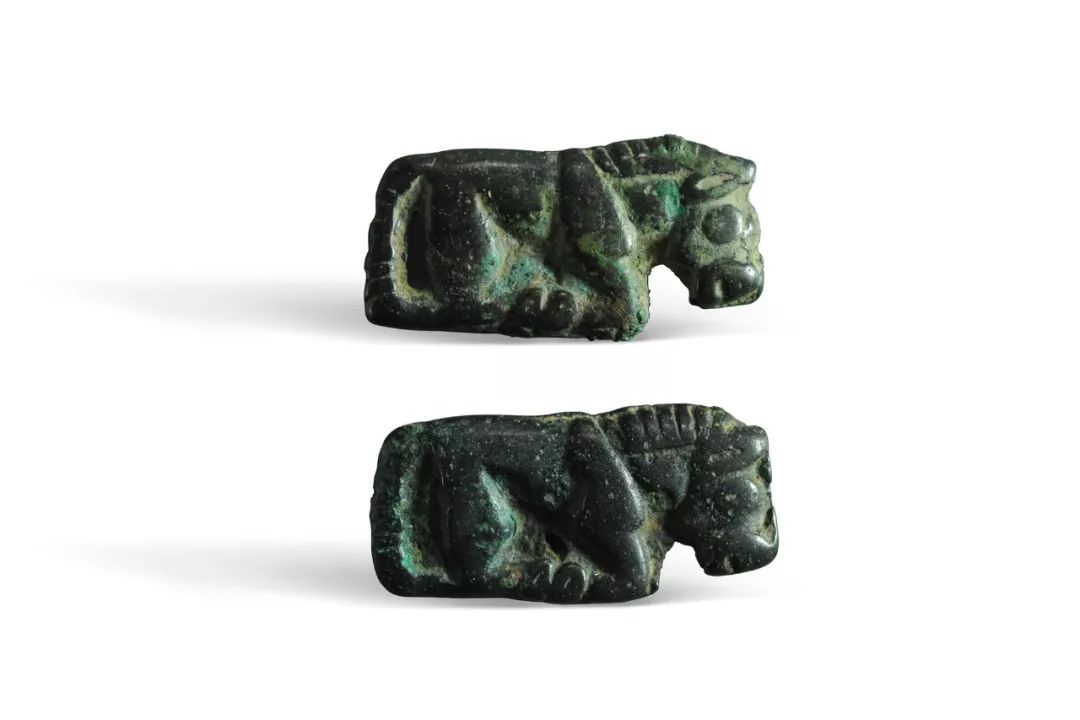 两件马首下垂,呈跪卧状,前肢向后回屈与后肢相连,长尾拖地。形态较为写实。背面有纽。