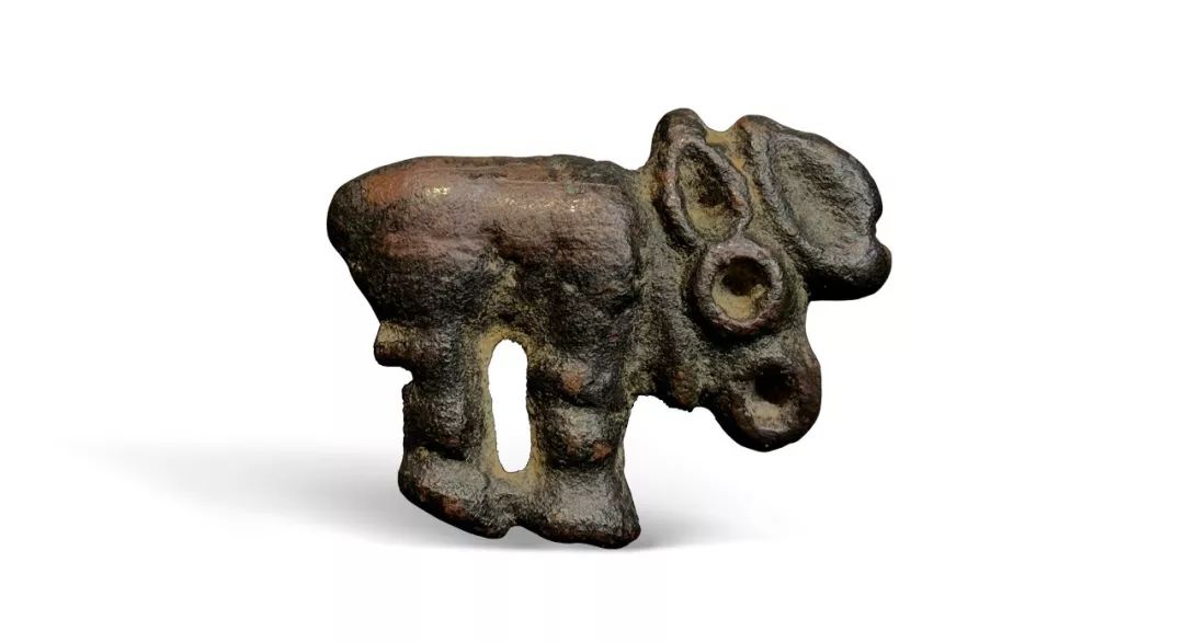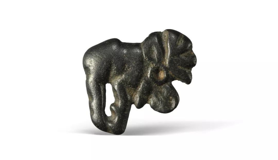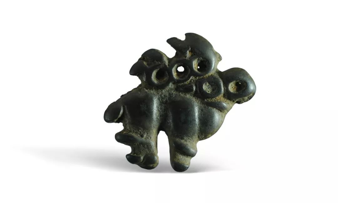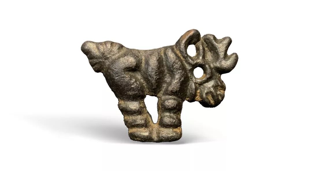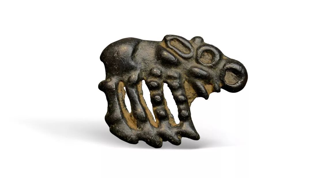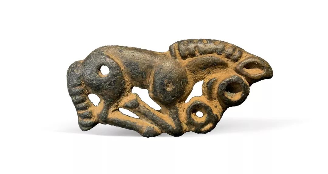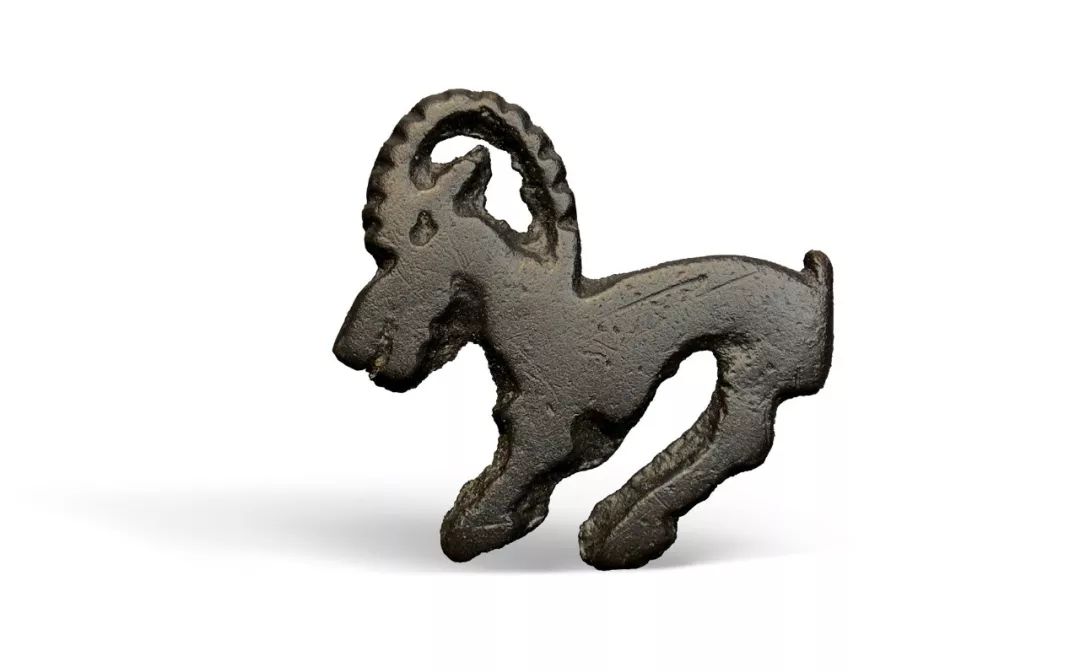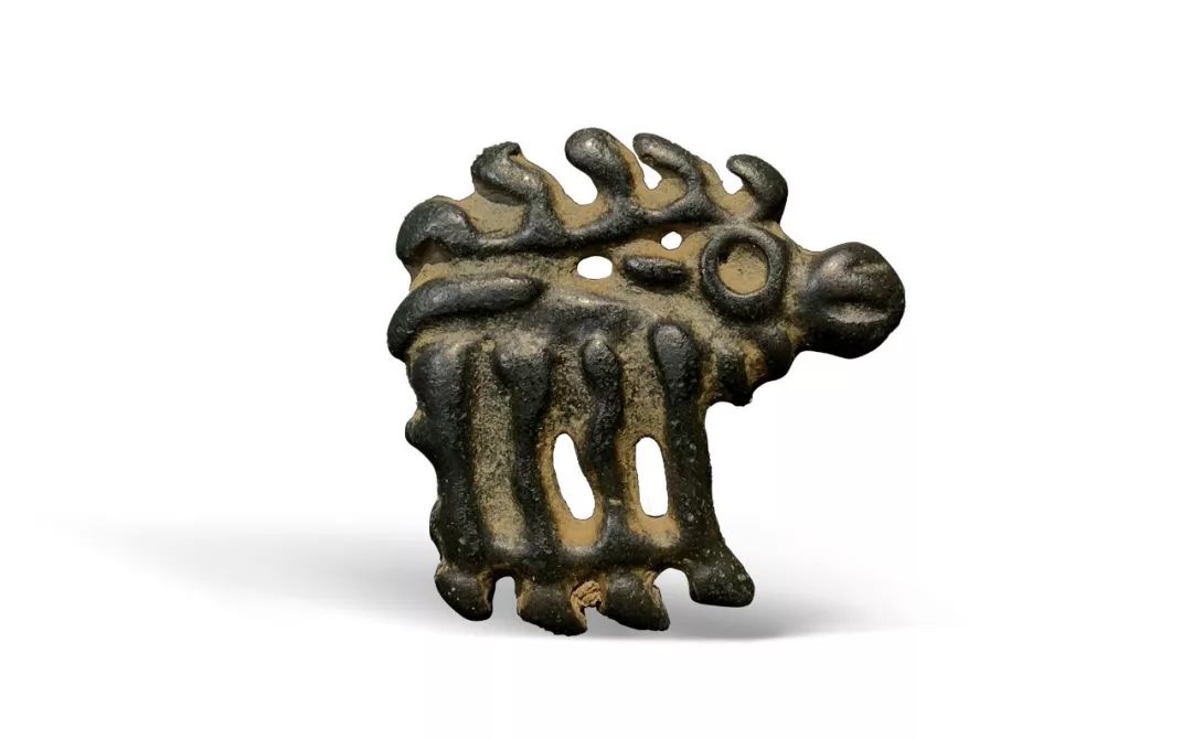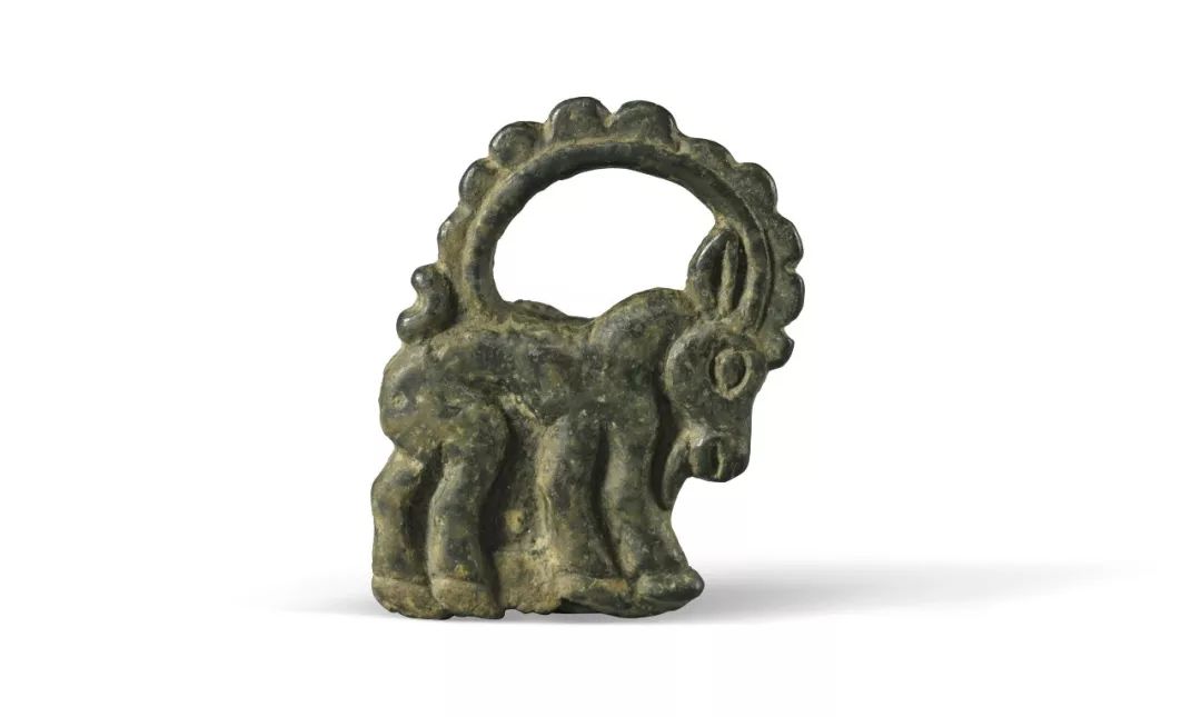 羊四肢直立,形体健壮,肌肉感强,眼为圆形镂孔,角向背部弯曲。背面有桥纽。