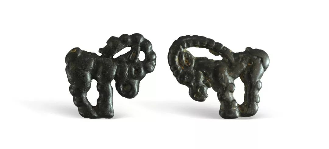 两件羊四肢直立,尾巴上翘。眼睛、鼻子呈圆环状,角向后弯曲与背部相连。背面均有纽。