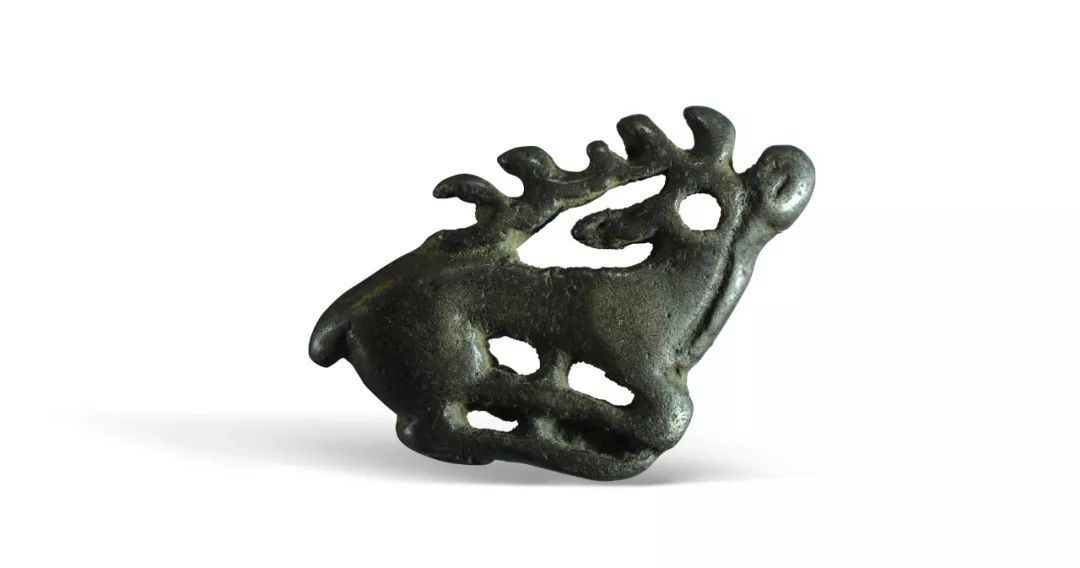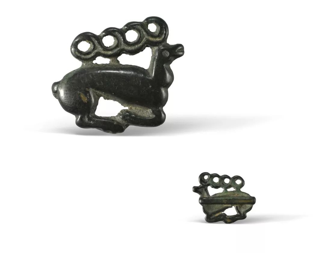 鹿直立,双足前后相连,头部长大,眼为嵌窝状,下颚有胡须,鹿角的枝杈似扇状,竖立在头顶上方。背面有纽。