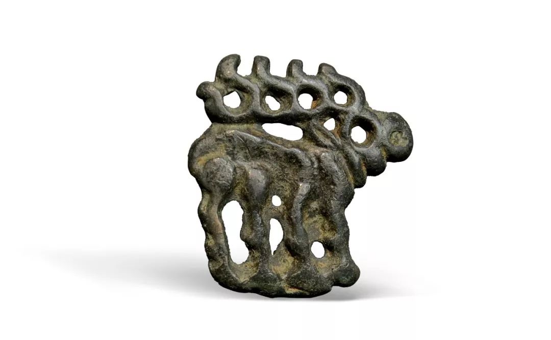 牌饰呈正方形,镂空透雕四鹿。四鹿以牌饰正中为轴心旋转排列,鹿首高昂,前肢踏于身前之鹿后颈处。