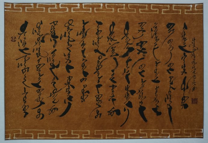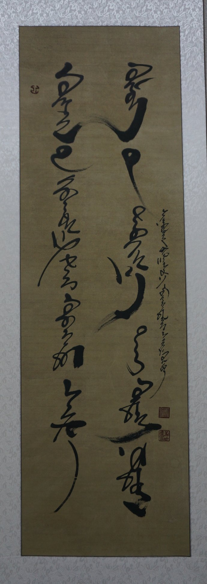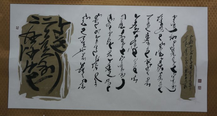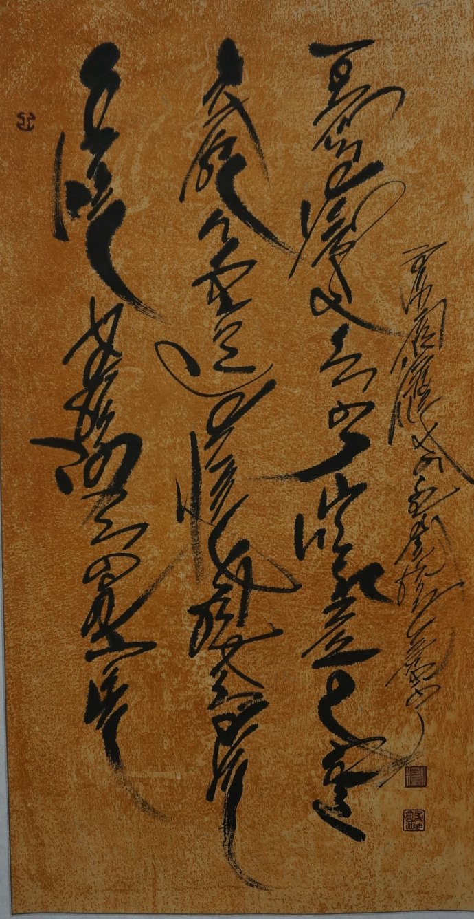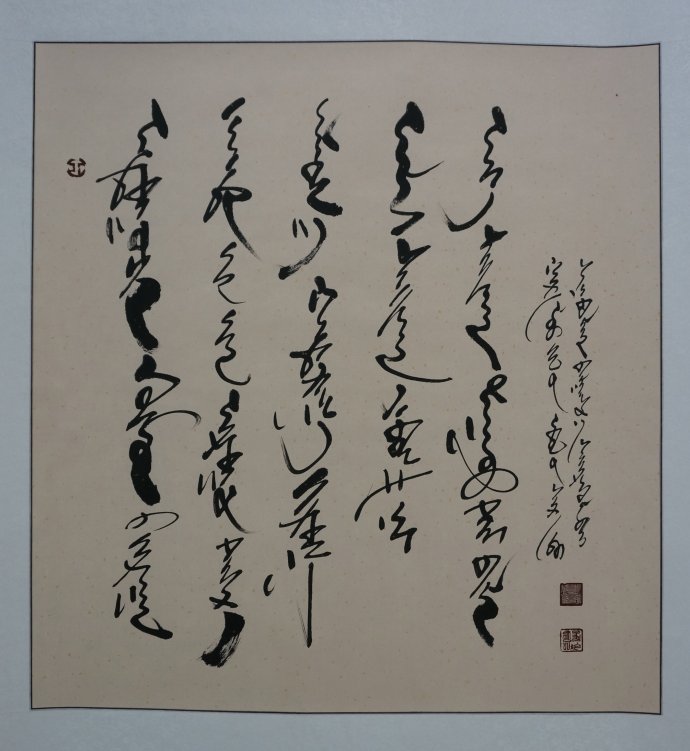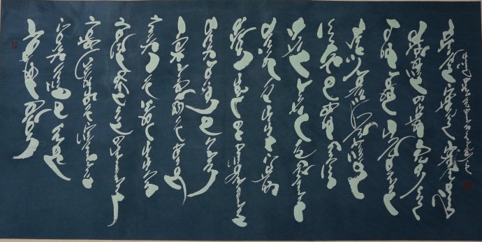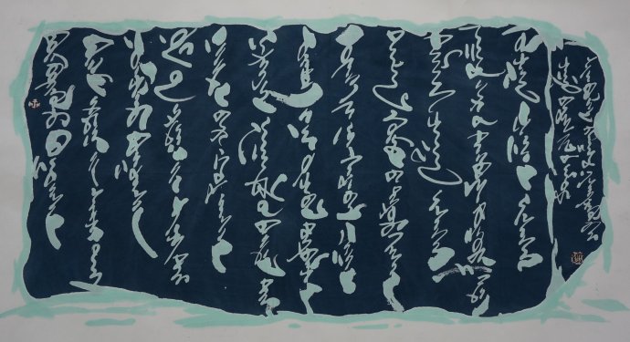 欣赏蒙文书法,我则更是一个门外汉,皆因在内蒙古工作多年,没少看过蒙文书法,对少数民族的这种书法,只感到有一种内涵深刻的功夫,犹如汉字书法、阿文书法一样,都是一种艺术品。孟克达来先生虽然是一位来自锡盟镶黄旗的书法家,但是从他的蒙文书法造诣上看,我感觉已经达到了一种炉火纯青的水平。我把他的书法作品搬进自己的博客中,目的一是欣赏少数民族的文字书法,再就是把他的作品推荐给更多喜欢蒙文书法的人们,让大家一起欣赏。