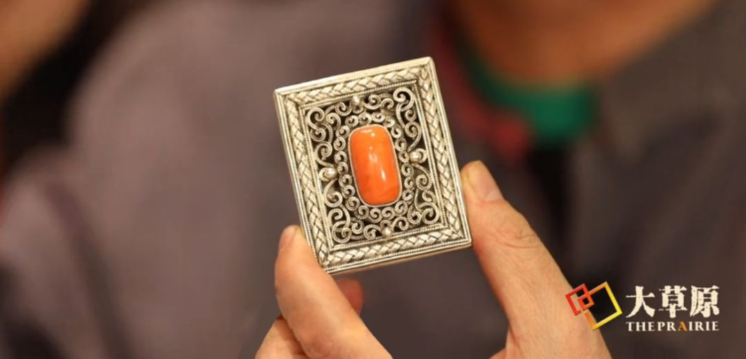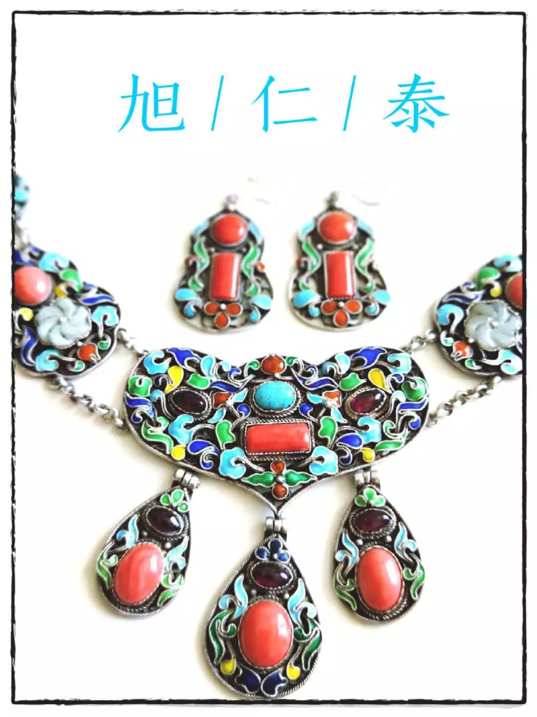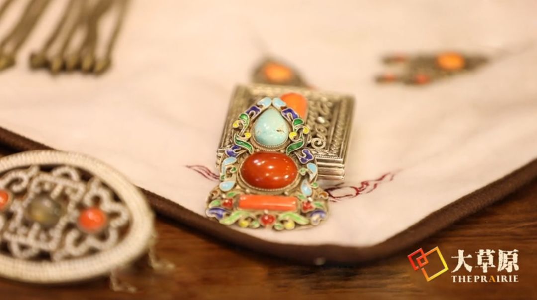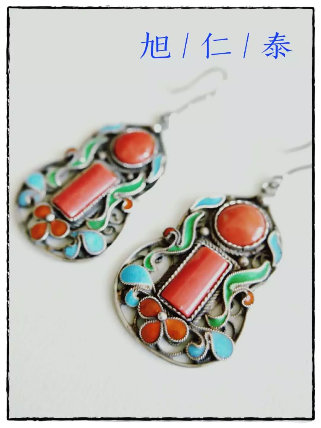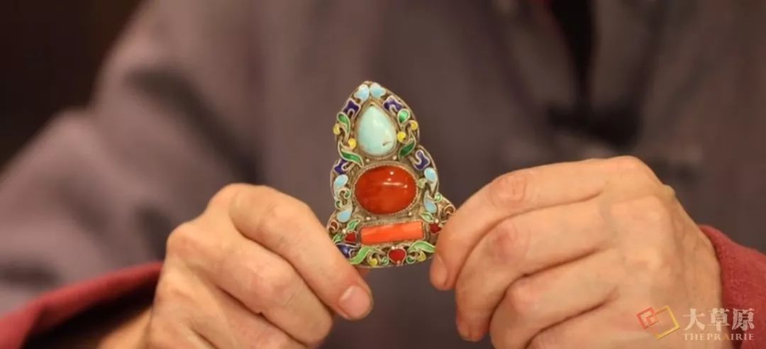 上图中的首饰曾经是蒙古族头饰的一部分,格日勒图将它单独拿出来加以改造,使用松石、南红、珊瑚等材料丰富其色彩和造型,在加工工艺上大胆的使用了烤蓝技术。喜欢这个首饰的人总会被它仿佛“佛龛”的造型吸引,于是这个蒙古族特色首饰被人们赋予了不同的含义。