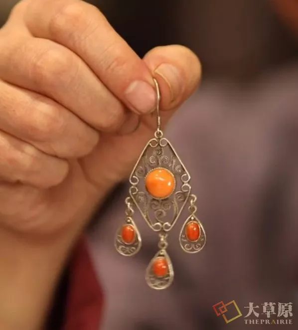 上面这枚耳环的设计也出自格日勒图之手,他在蒙古族传统工艺花丝的基础上,增加了灵动的珠子,使外形看起来像孔雀开屏,极具美感。