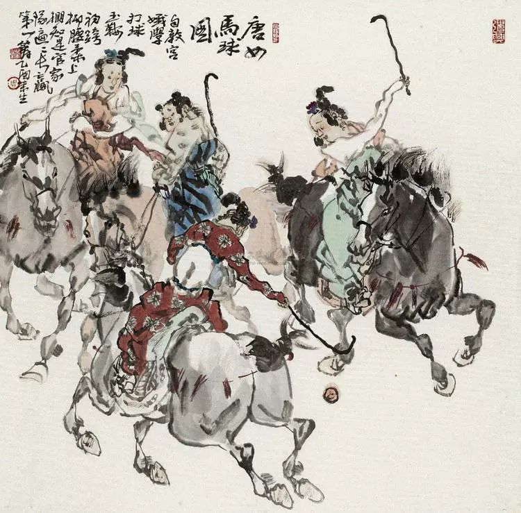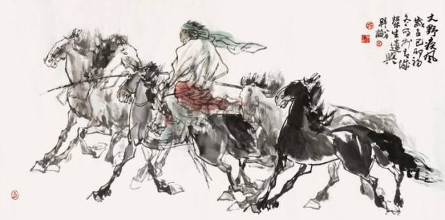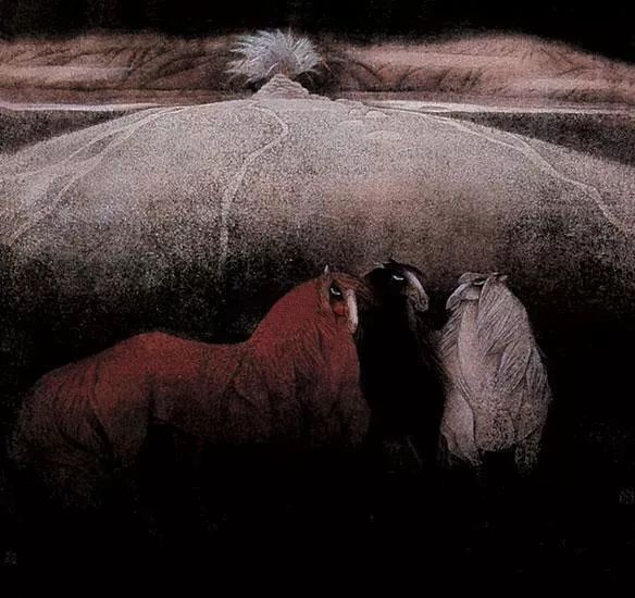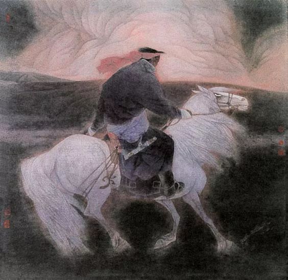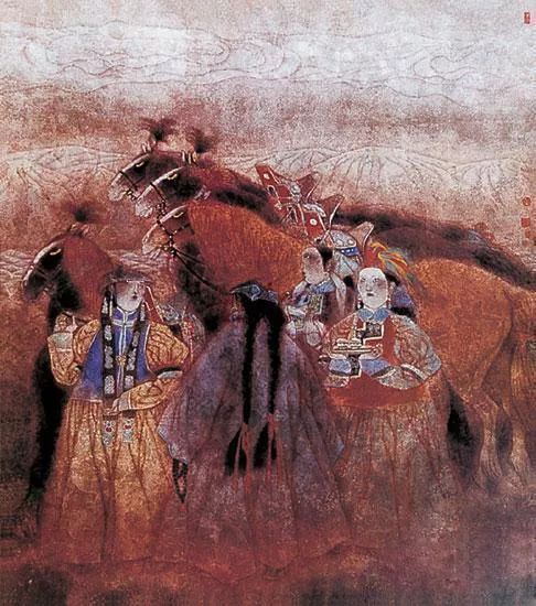 荣生的画主要有两类,一是工笔重彩,二是水墨写意。他的前期创作基本上是工笔画。荣生工笔画的最显著特点是厚重、浑朴并有一定装饰性。在创作中,他很好地利用画面营造出一种凝重、冷寂、苍凉的意蕴,这与他所反映的草原大漠、森林冻土的主题很贴切,既充分表现了北方民族的人文风貌,又深刻揭示出草原文化的内涵。他在《草原之梦》《日之蚀》《冻土带》《祭敖包》《金色圣山》等作品中,以牧人、草原、山川、马、驯鹿等形象符号组成一个既非纯客观、又非纯主观的画面,让人体会到一种“天人合一”的意境。造型上适度夸张,色彩上浓烈淳厚,空间背景“计黑当白”,他的画已经不是人们习惯的蓝天白云的草原,而是一个经由画家再造的精神家园。荣生的工笔画,走的是“重彩”一路,在表现手法上吸收了很多中国传统壁画的绘画语言。不追求个体形象的独特,而是注重画面形象的整一;不作精雕细刻、毛发毕现的再现,而是强调整体画面的视觉张力,这是他有意的追求,也是他工笔画个人面貌形成的重要因素。因此,他的画明显区别于那些尽精微、重细节的工笔作品。