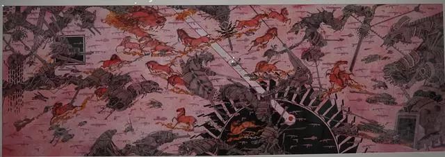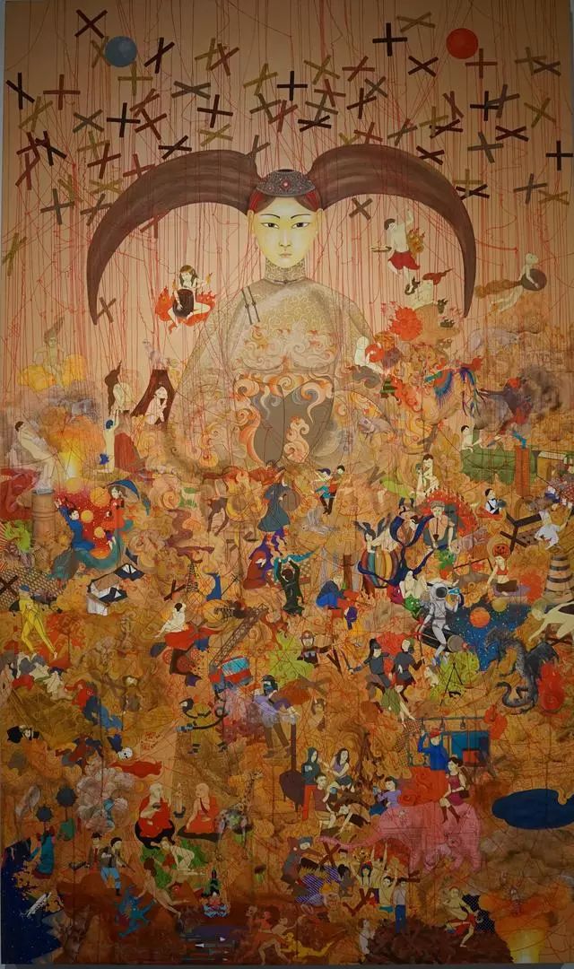 艺术家将蒙古传统草原、宗教元素,和当代的政客和娱乐等元素,完美的结合起来,创作了这幅充满趣味又耐人寻味的《现代游牧》。