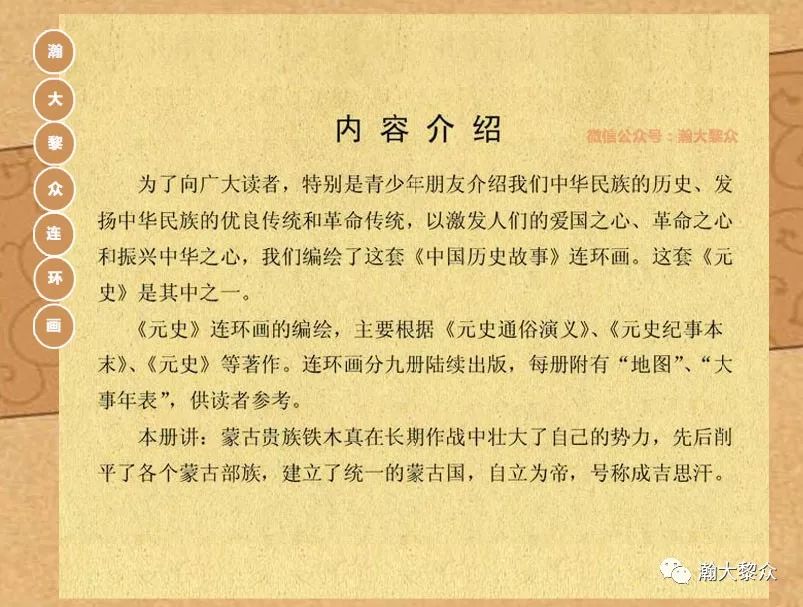 元朝(1271年—1368年)由忽必烈于1271年建立。其前身是成吉思汗所建立的大蒙古国。是中国历史上首次由少数民族建立的大一统王朝。定都大都(今北京),传五世十一帝,历时九十八年。元朝结束了唐末以来(五代十国宋辽金夏)国内分裂割据和几个政权并立的政治局面。元朝的统一,还加强了中外文化交流和中西交通的发展。元朝在地方体制上面创立了行省制度,沿用至今。《元史》连环画的编绘,主要根据《元史通俗演义》、《元史纪事本末》、《元史》等著作。连环画分十册,每册附有“地图”、“大事年表”,供读者参考