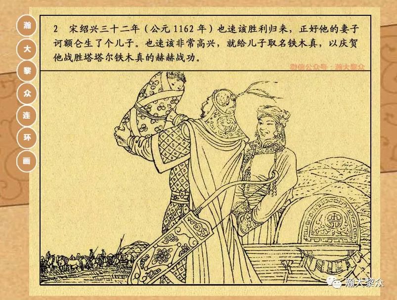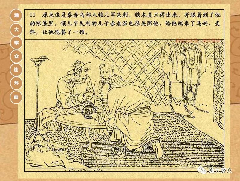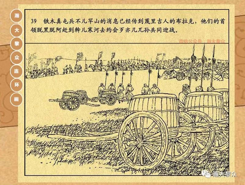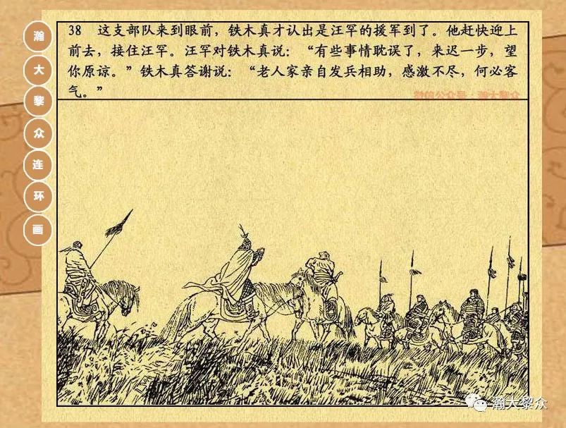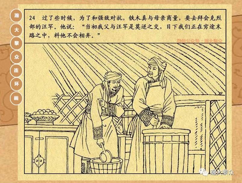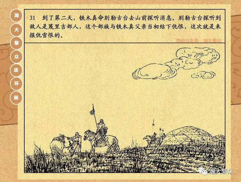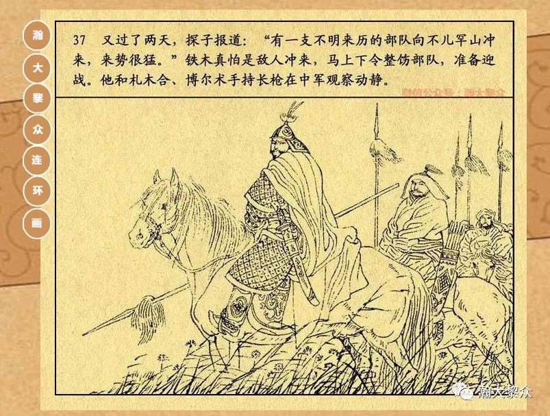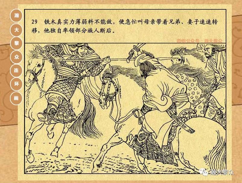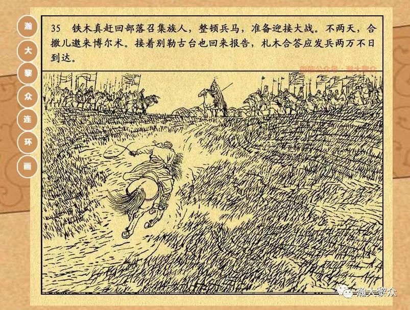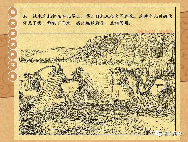 36铁木真扎营在不儿罕山,第二日札木合军到来。这两个儿时的伙伴见了面,都跳下马来,高兴地拉着手,互相问候。