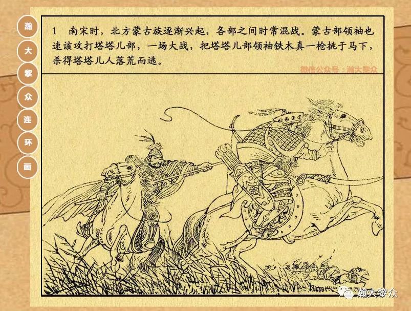 1南宋时,北方蒙古族逐渐兴起,各部之间时常混战。蒙古部领袖也速该攻打塔塔儿部,一场战,把塔塔儿部领袖铁木真一枪挑于马下,杀得塔塔儿人落荒而逃。