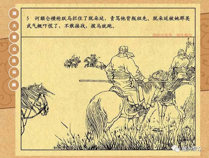 5诃额仑横枪跃马拦住了脱朵延,责骂他背叛祖先。脱朵延被她那英武气概吓慌了,不敢接战,拨马就跑。