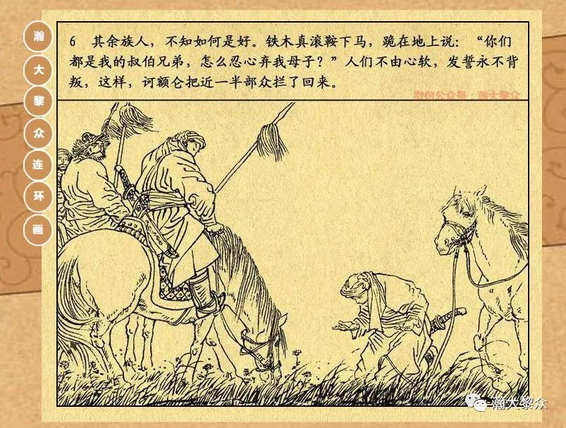 6其余族人,不知如何是好。铁木真滚鞍下马,跪在地上说:“你们都是我的叔伯兄弟,怎么忍心弃我母子?”人们不由心软,发誓永不背叛,这样,诃额仑把近一半部众拦了回来。