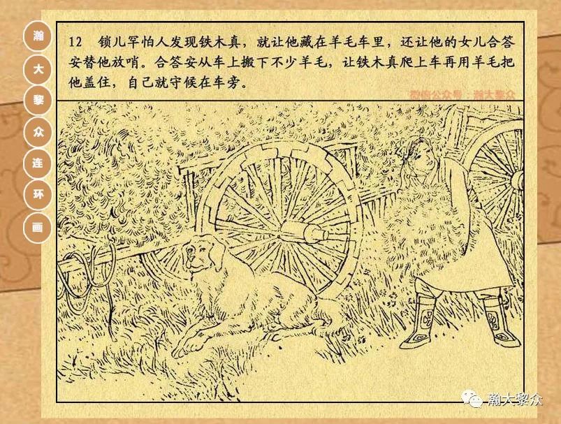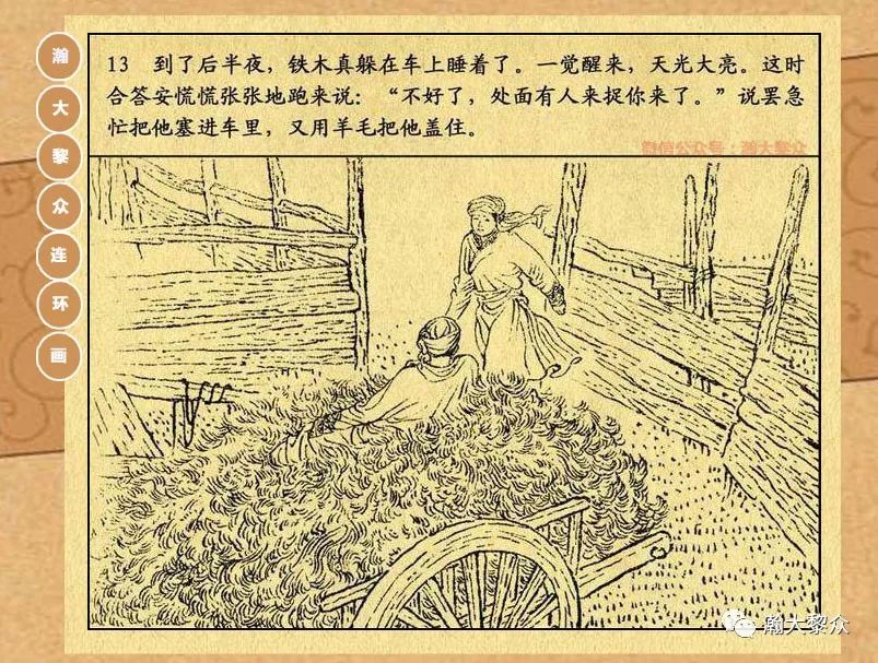 12锁儿罕怕人发现铁木真,就让他藏在羊毛车里,还让他的女儿合答安替他放哨。合答安从车上搬下不少羊毛,让铁木真爬上车再用羊毛把他盖住,自己就守候在车旁。