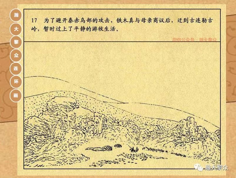 17为了避开泰赤乌部的攻击,铁木真与母亲商议后,迁到古连勒古岭,暂时过上了平静的游牧生活。