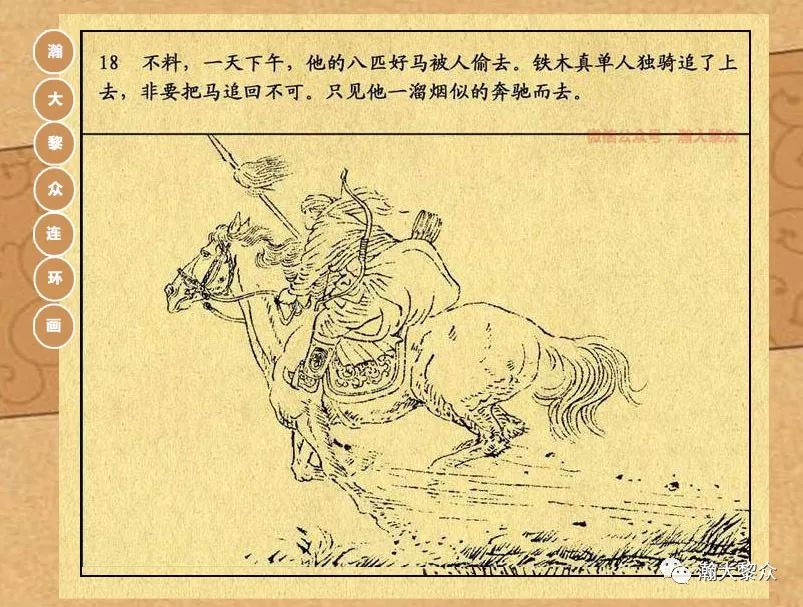 18不料,一天下午,他的八匹好马被人偷去。铁木真单人独骑追了上去,非要把马追回不可。只见他一溜烟似的奔驰而去。