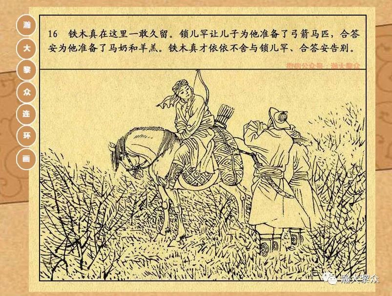 16铁木真在这里不敢久留。锁儿罕让儿子为他准备了弓箭马匹,合答安为他准备了马奶和羊羔。铁木真才依依不舍与锁儿罕、合答安告别。