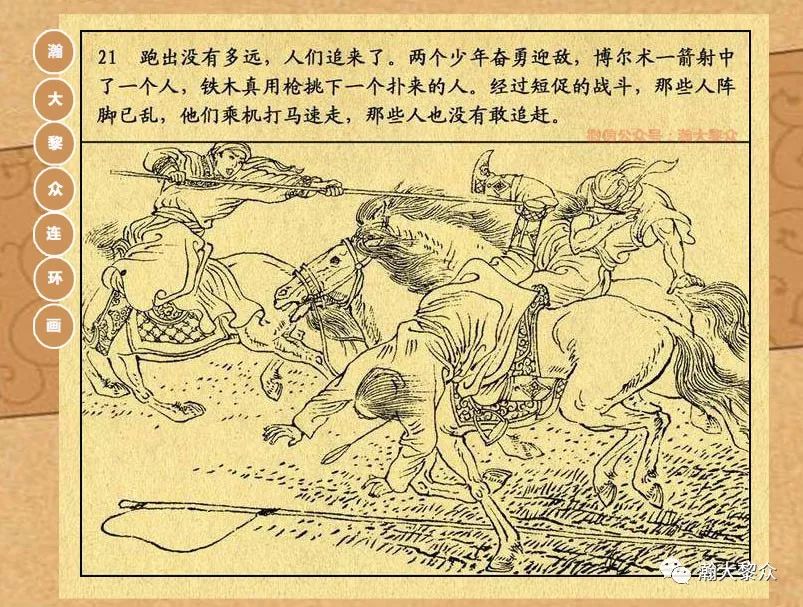 21跑出没有多远,人们追来了。两个少年奋勇迎敌,博尔术一箭射中了一个人,铁木真用枪挑下一个扑来的人。经过短促的战斗,那些人阵脚已乱,他们乘机打马速走,那些人也没有敢追赶。