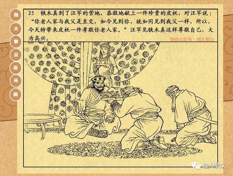 25铁木真到了汪罕的营地,恭敬地献上一件珍贵的皮袄,对汪罕说:“你老人家与我父是至交,如今见到你,就如同见到我父一样,所以,今天特带来皮袄一件孝敬你老人家。”汪罕见铁木真这样尊敬自己,大为高兴。