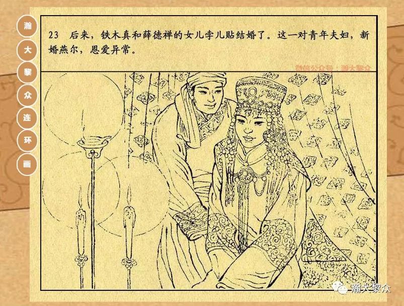23后来,铁木真和薛徳禅的女儿孛儿贴结婚了。这一对青年夫妇,新婚燕尔,思爱异常。