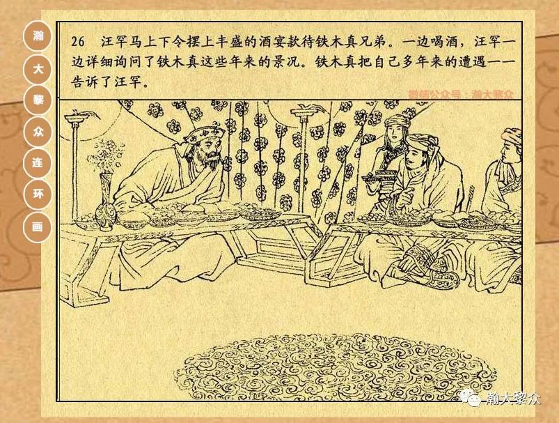 26汪罕马上下令摆上丰盛的酒宴款待铁木真兄弟,一边喝酒,汪罕一边详细询问了铁木真这些年来的景况。铁木真把自己多年来的遭遇一一告诉了汪罕。