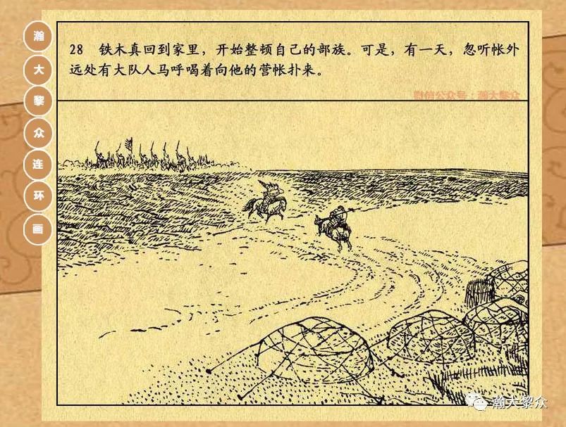 28铁木真回到家里,开始整顿自己的部族。可是,有一天,忽听帐外远处有大队人马呼喝着向他的营帐扑来。