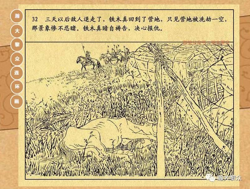 32三天以后敌人退走了,铁木真回到了营地,只见营地被冼劫一空,那景象惨不忍睹。铁木真暗自祷告,决心报仇。