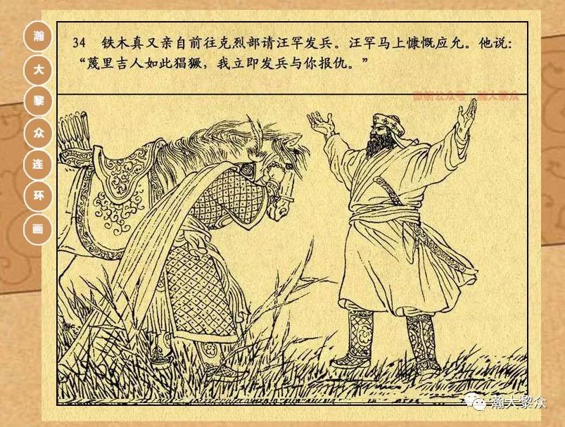 34铁木真又亲自前往克烈部请汪罕发兵。汪罕马上慷慨应允。他说:“蔑里吉人如此猖獗,我立即发兵与你报仇。”