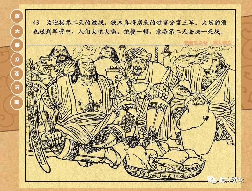 43为迎接第二天的激战,铁木真将虏来的牲畜分赏三军。大坛的酒也送到军营中,人们大吃大喝,饱餐一顿,准备第二天去决一死战。