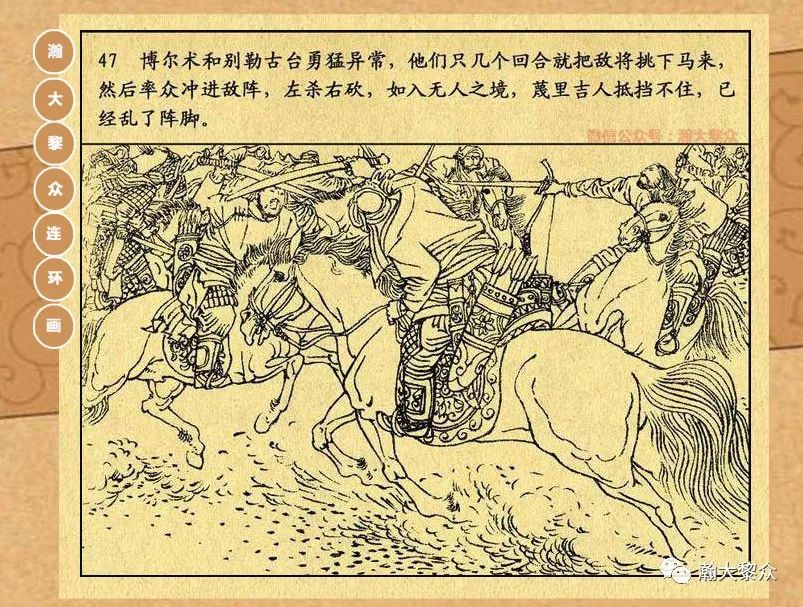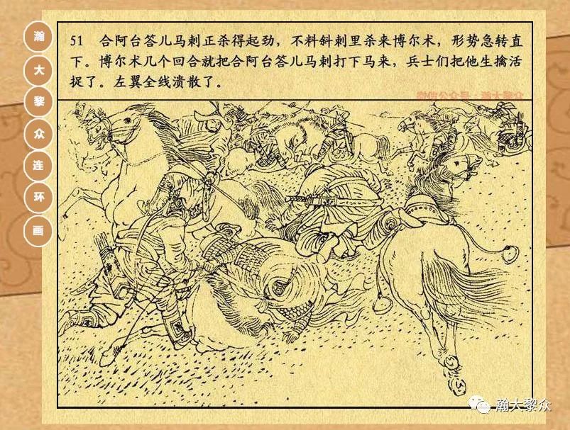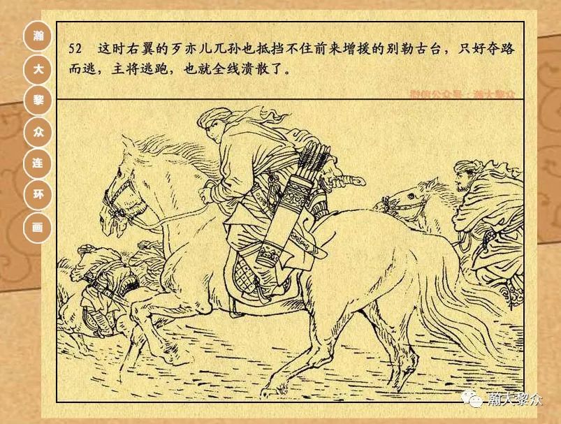 52这时右翼的歹亦儿兀孙也抵挡不住前来增援的别勒古台,只好夺路而逃,主将逃跑,也就全线溃散了。