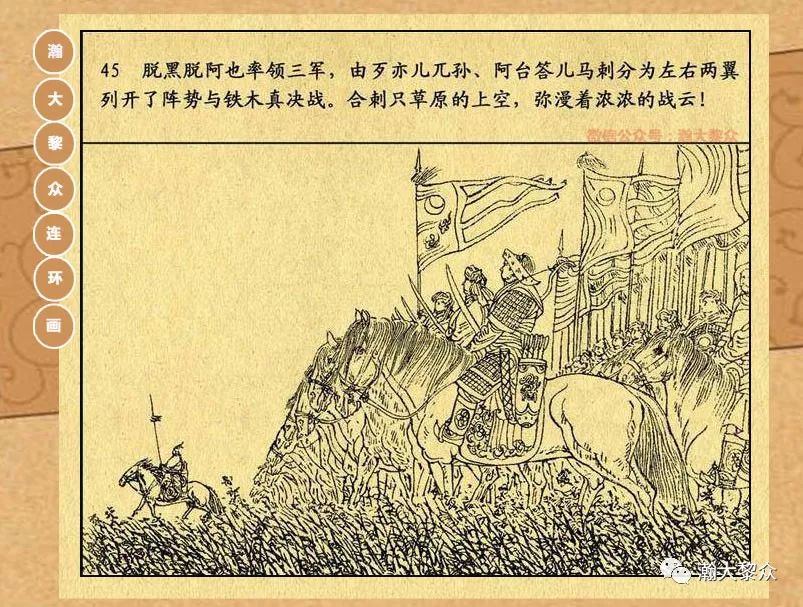 45脱黑脱阿也率领三军,由歹亦儿几孙、阿台答儿马刺分为左右两翼列开了阵势与铁木真决战。合刺只草原的上空,弥漫着浓浓的战云!
