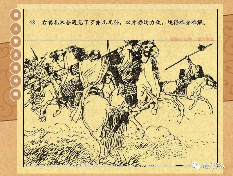 48右翼札木合遇见了歹亦儿兀孙,双方势均力敌,战得难分难解。