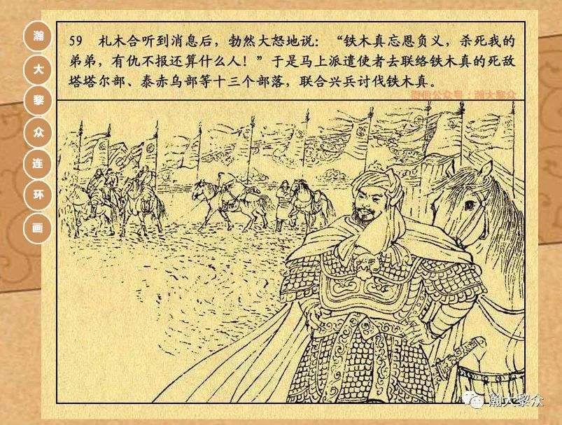 59札木合听到消息后,勃然怒地说:“铁木真忘恩负义,杀死我的弟弟,有仇不报还算什么人!”于是马上派遣使者去联络铁木真的死敌塔塔尔部、泰赤乌部等十三个部落,联合兴兵讨伐铁木真。