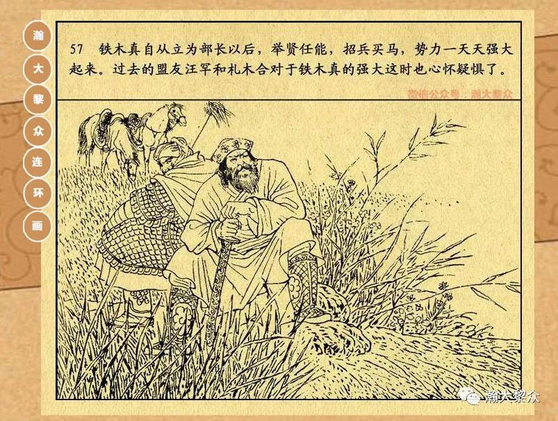 57铁木真自从立为部长以后,举贤任能,招兵买马,势力一天天强大起来。过去的盟友汪罕和札木合对于铁木真的强这时也心怀疑惧了。