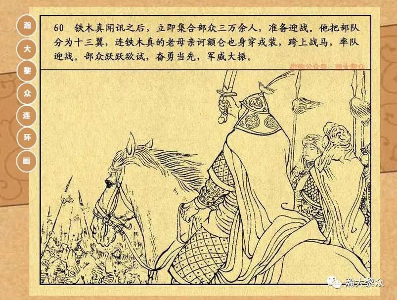 60铁木真闻讯之后,立即集合部众三万余人,准备迎战。他把部队分为十三翼,连铁木真的老母亲订额仑也身穿戎装,跨上战马,率队迎战。部众跃跃欲试,奋勇当先,军威大振。